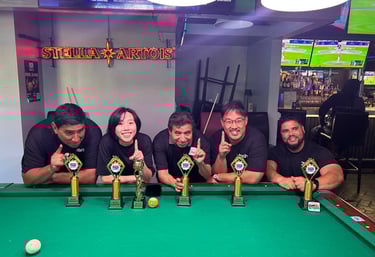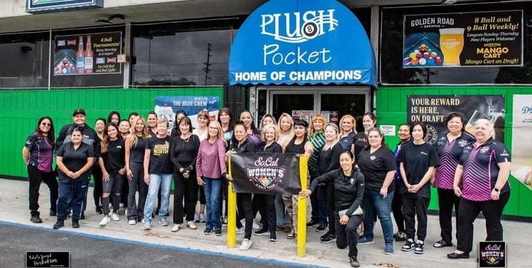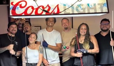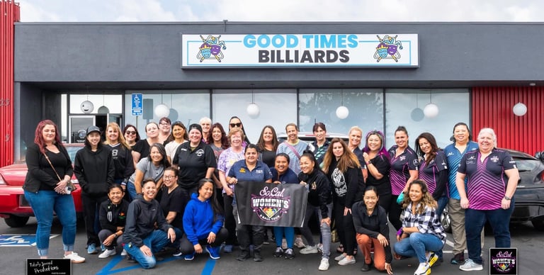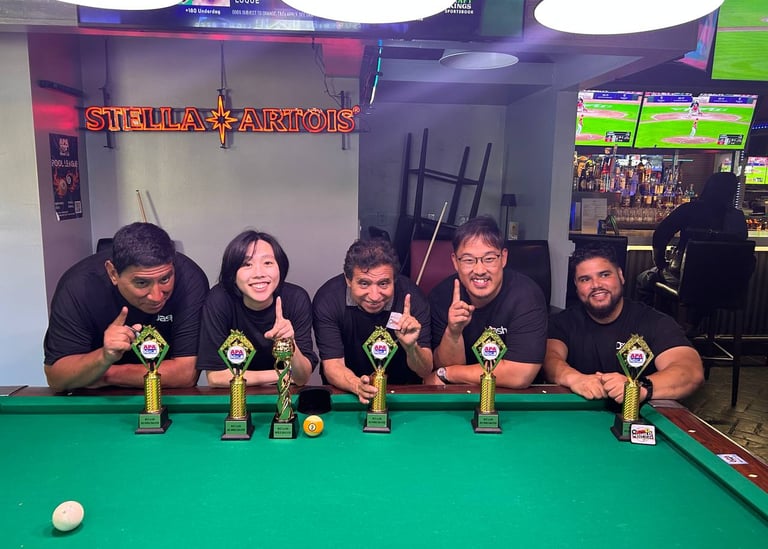 A snapshot of teams and players in pool league and tournaments, capturing moments and faces.